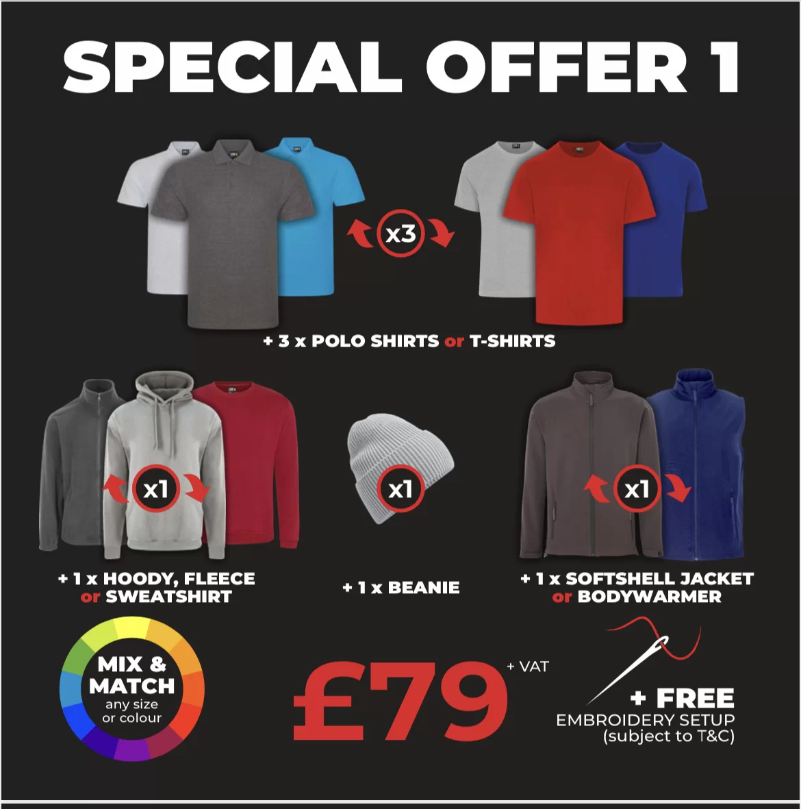 We offer four different bundle deals to suit your needs, starting with our basic bundle for just £54+VAT. Our other bundle deals include t-shirts, hoodies, and more, with the option to add additional embroidery or print if required. Whatever your requirements, our bundle deals make it easy to personalize your workwear quickly and affordably.
